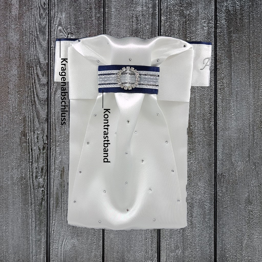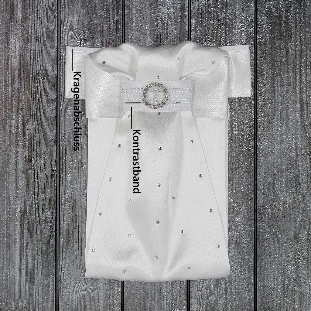 Das Plastron besteht aus nur einem Teil und braucht nach dem Waschen nicht mehr zusammengesteckt werden. Zu dem sorgt ein Klettverschluss hinten für schnelles An- und Ablegen und macht es passend für jeden Halsumfang. Das Standardmaß hat eine Höhe von ca. 4,5 cm und eine Gesamtlänge von ca. 42 cm.